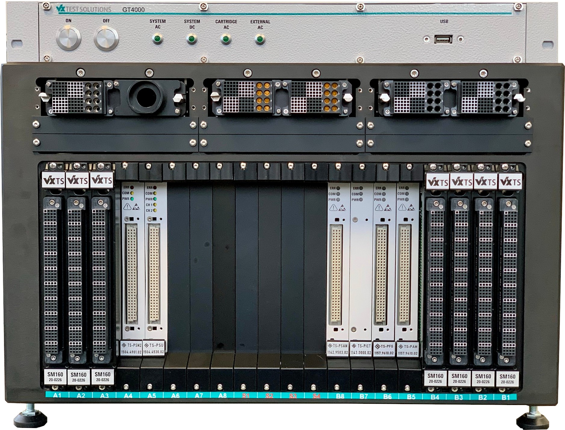 For the GT4000 test system series, we offer various exchangeable cassettes (cartridges), of which up to two can be installed in the cartridge area. Functionalities or hardware components required for the test can be integrated into the cartridges. These exchangeable cartridges are simply plugged into the back of the GT4000 test system and fixed in place with screw connections. Thus, the cartridges are designed to be very maintenance-friendly.